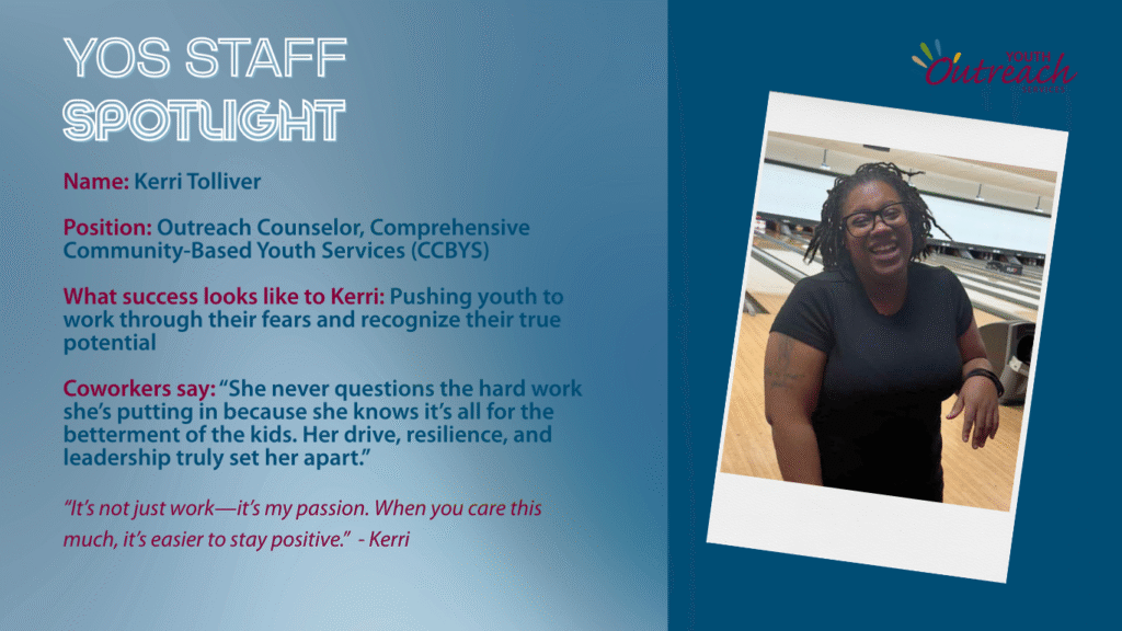 Meet Kerri Toliver, one of our incredible Outreach Counselors at Youth Outreach Services. In just over two years at YOS, Kerri has already built strong, meaningful connections with the young people she serves, their families, and the colleagues she works alongside.